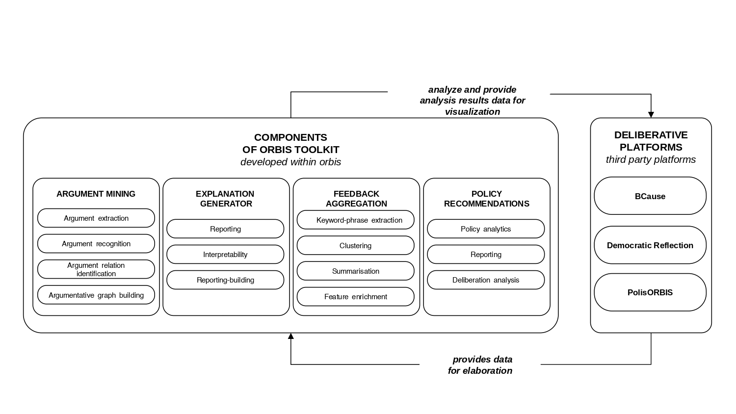 This toolkit is integrated within various project-specific deliberative platforms: BCause, PolisOrbis, and Democratic Reflection, each designed to meet unique deliberative requirements.